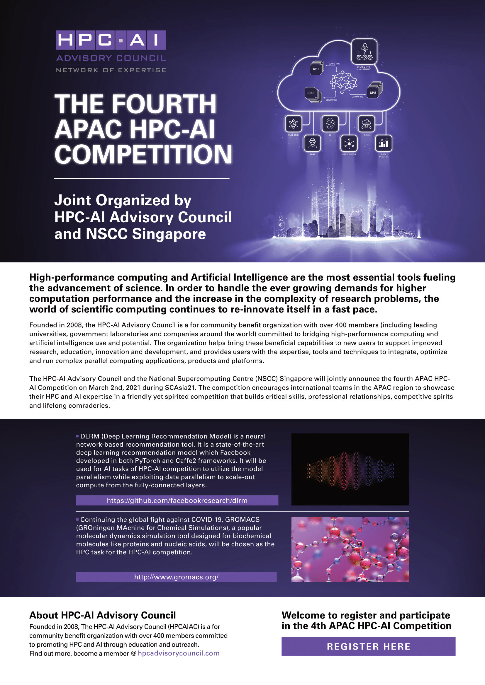 To become part of a team – register here - http://www.hpcadvisorycouncil.com/events/2021/APAC-AI-HPC/register.php