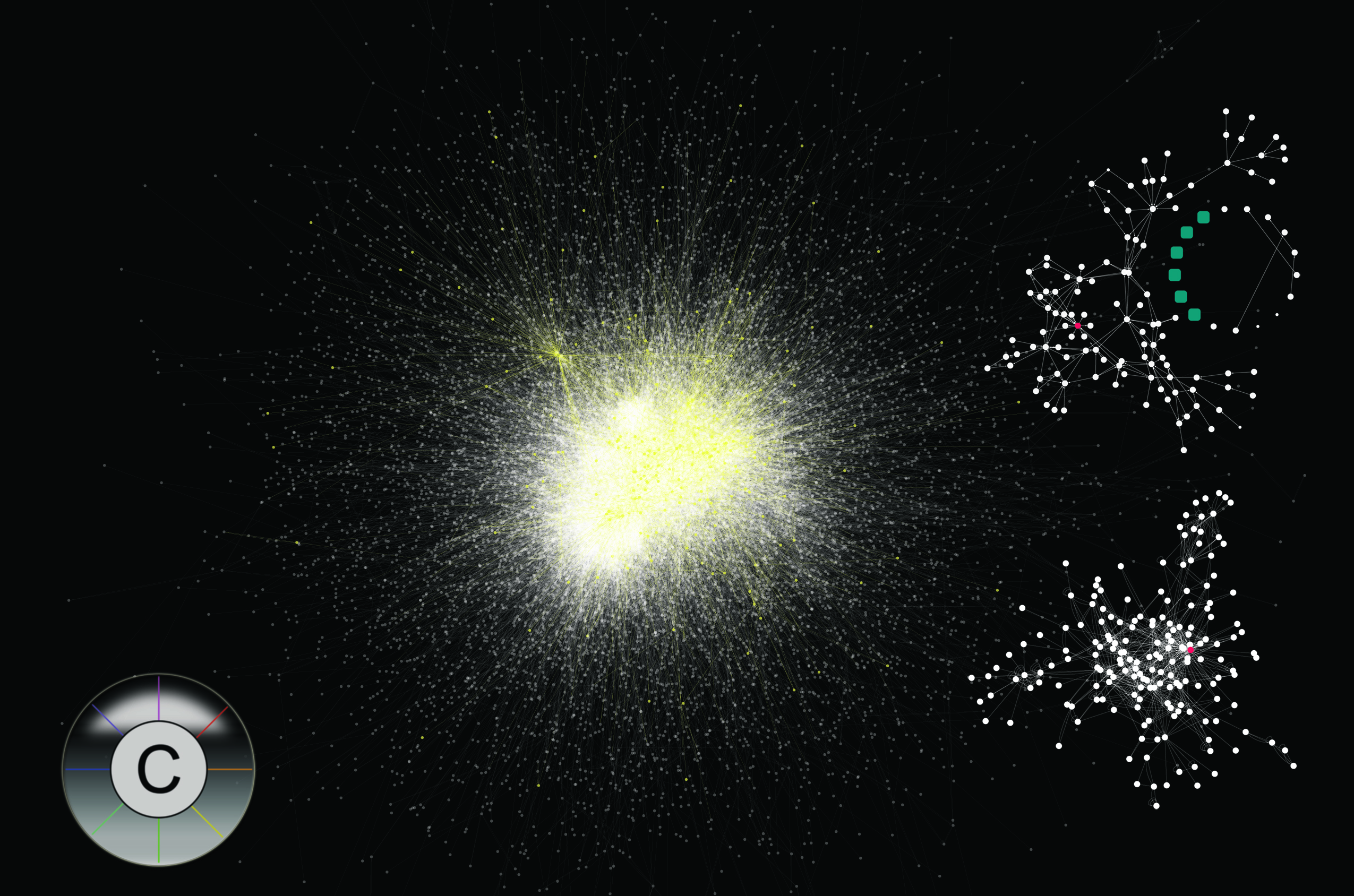 Mr. Keiichiro Ono University of California, San Diego, USA Human Interactome Analysis of biological networks is one of a hot topic in biology today. To understand the complex biological circuits (i.e., protein-protein interactions, protein-DNA interactions, etc.) data integration and visualization are two important technology. This image represents a typical workflow of biologists working on this hard problem. The center image is known human protein-protein interactions (called interactome) visualized by Cytoscape (http://www.cytoscape.org). This network is created by merging multiple data sources, including HPRD, BIND, BioGRID, and IntAct. Yellow nodes are proteins exist on known pathway (MAPK Signaling Pathway in KEGG database) and lower-right image is a visualization of the sub network. Upper-right network image is a visualization of the MAPK Signaling Pathway directly taken from KEGG database. You may notice that both of the smaller images have a red node. It is MAPK14 protein (Entrez Gene ID 1432). This type of visualization is useful when you want to map your own experimental data onto known pathways. All of these data integration, mapping, and visualization were done in Cytoscape. |