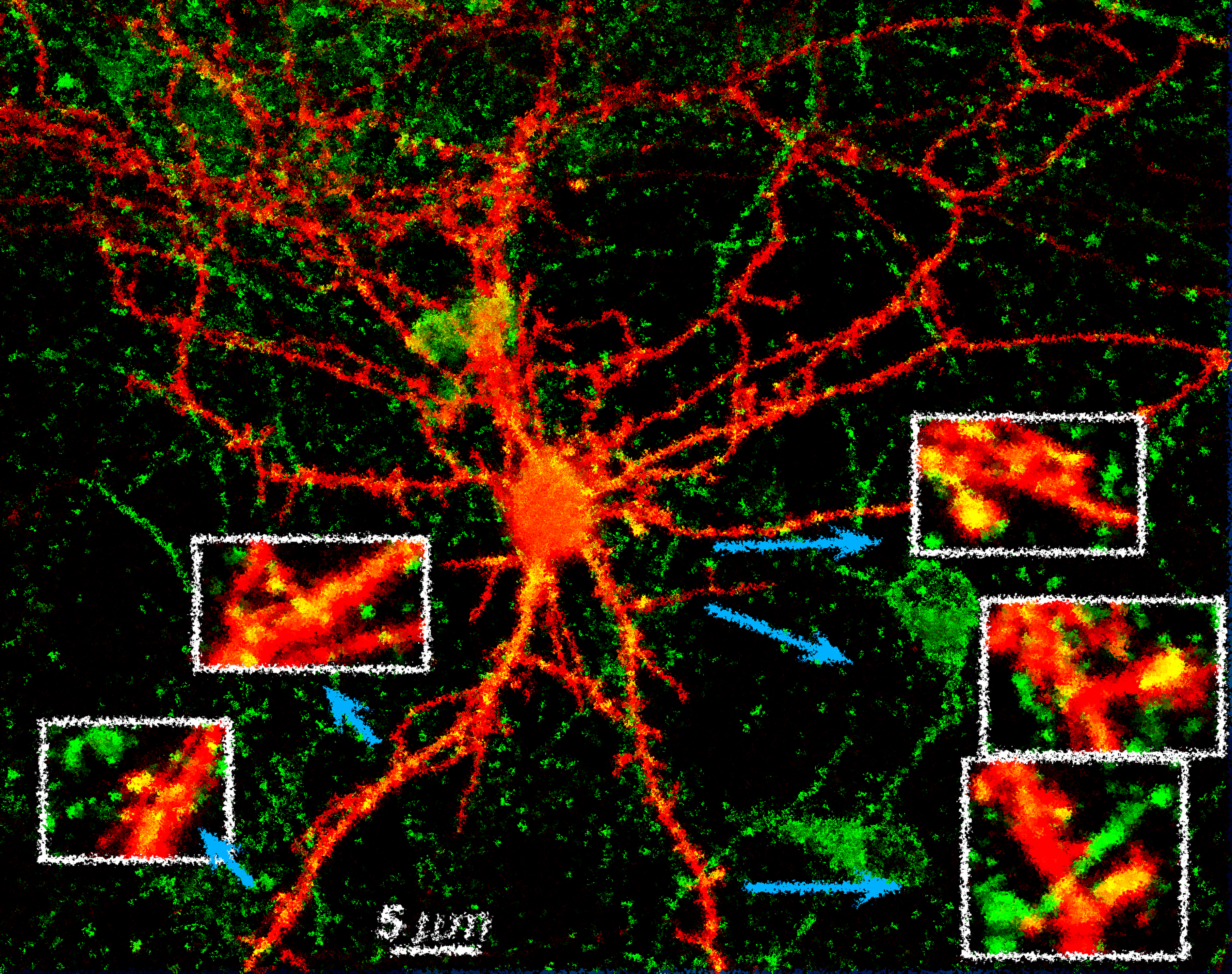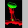 Dr.Eduard Korkotian Weizmann Institute of Science Rehovot, ISRAEL A Sinapse. Dendritic spine of the presynaptic neuron (labeled with red fluorescent protein, red) is innervated with a presynaptic terminal (labeled with green fluorescent protein tagged synapse-specific protein, green). The size of a synapse is about 1 micron. |