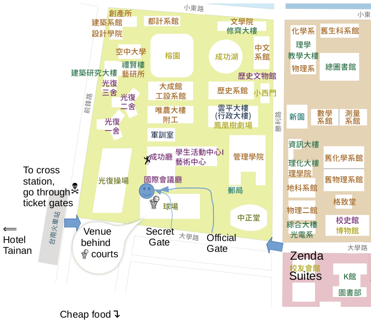 The conference will be held at the International Conference Hall, located on the National Cheng-Kung University (NCKU) campus, located just a 10-minute walk from the rear entrance to the Tainan Station. (Note this is the Taiwan Railways station in the city center, not the High Speed Rail Station)