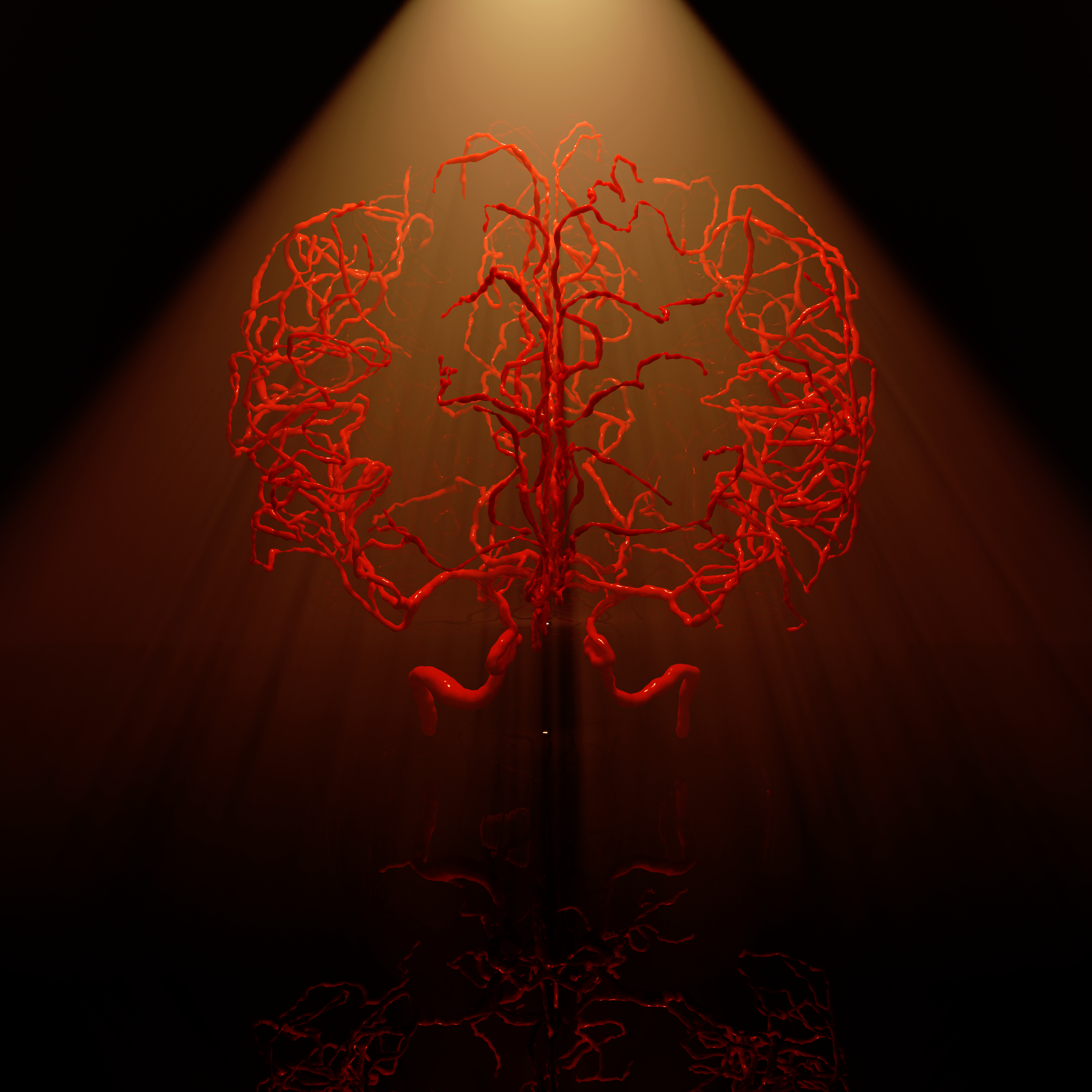 An artistic rendering of a digital reconstruction of the human brain arterial arborizations.