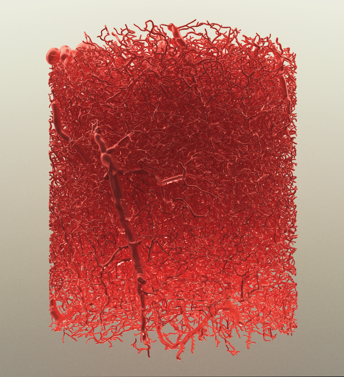 Dataset is available from the Brain Vasculature (BraVa) database. The mesh reconstruction is performed with NeuroMorphoVis and the rendering is obtained with Cycles.